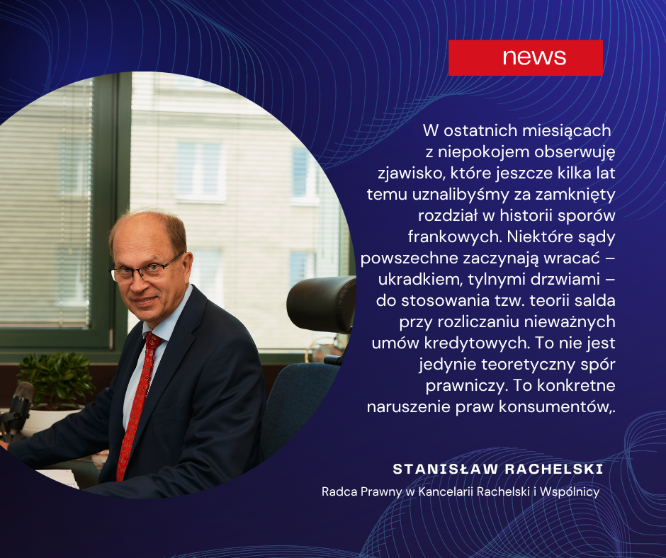 W ostatnich miesiącach z niepokojem obserwuję zjawisko, które jeszcze kilka lat temu uznalibyśmy za zamknięty rozdział w historii sporów frankowych. Niektóre sądy powszechne zaczynają wracać – ukradkiem, tylnymi drzwiami – do stosowania tzw. teorii salda przy rozliczaniu nieważnych umów kredytowych. To nie jest jedynie teoretyczny spór prawniczy. To konkretne naruszenie praw konsumentów, sprzeczne z linią orzeczniczą Trybunału Sprawiedliwości Unii Europejskiej oraz Sądu Najwyższego.