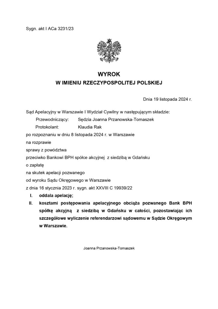 Sąd Apelacyjny w Warszawie oddalił apelację Banku BPH, utrzymując w mocy wyrok korzystny dla naszego Klienta. Sprawa dotyczyła kredytu frankowego. Sąd uznał, że nasza argumentacja była w pełni zasadna – a umowa kredytowa zawierała klauzule abuzywne, które nie powinny nigdy wiązać konsumenta.