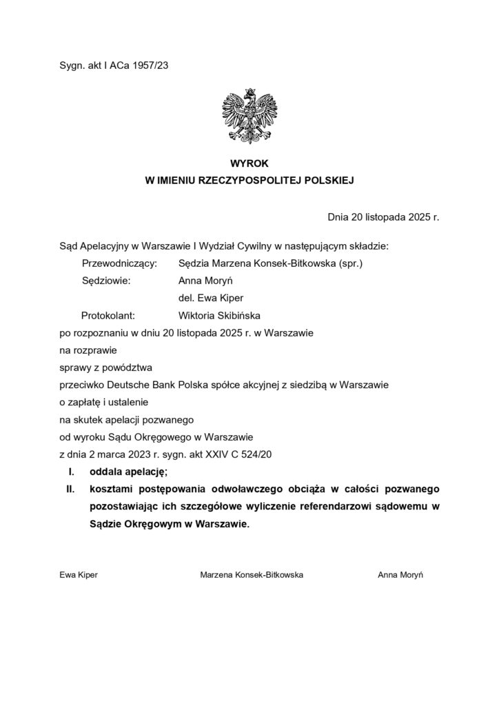 Wyrok Sądu Apelacyjnego w Warszawie: kolejna prawomocna wygrana z Deutsche Bank Polska S.A.
