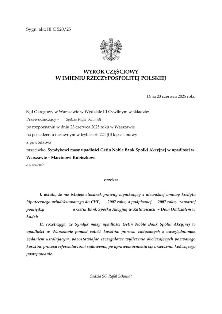 Sąd Okręgowy w Warszawie w Wydziale III Cywilnym po rozpoznaniu sprawy przeciwko Syndykowi masy upadłości Getin Noble Bank Spółki Akcyjnej w upadłości w Warszawie – Marcinowi Kubiczkowio ustalił, że nie istnieje stosunek prawny wynikający z nieważnej umowy kredytu hipotecznego z 2007 roku zawartej pomiędzy naszymi klientami a Getin Bank Spółką Akcyjną w Katowicach – Dom Oddziałem w Łodzi.