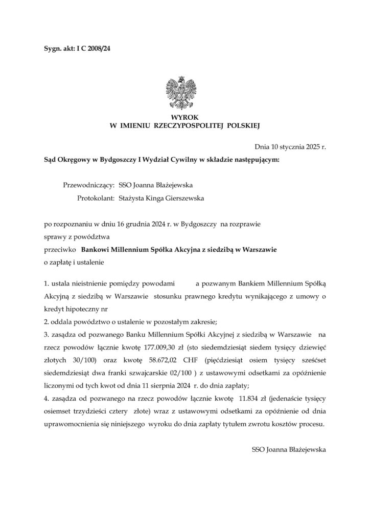 Zasądził od pozwanego Banku Millennium Spółki Akcyjnej z siedzibą w Warszawie na rzecz powodów łącznie kwotę 177.009,30 zł oraz kwotę 58.672,02 CHF z ustawowymi odsetkami za opóźnienie liczonymi od tych kwot od dnia 11 sierpnia 2024 r. do dnia zapłaty.