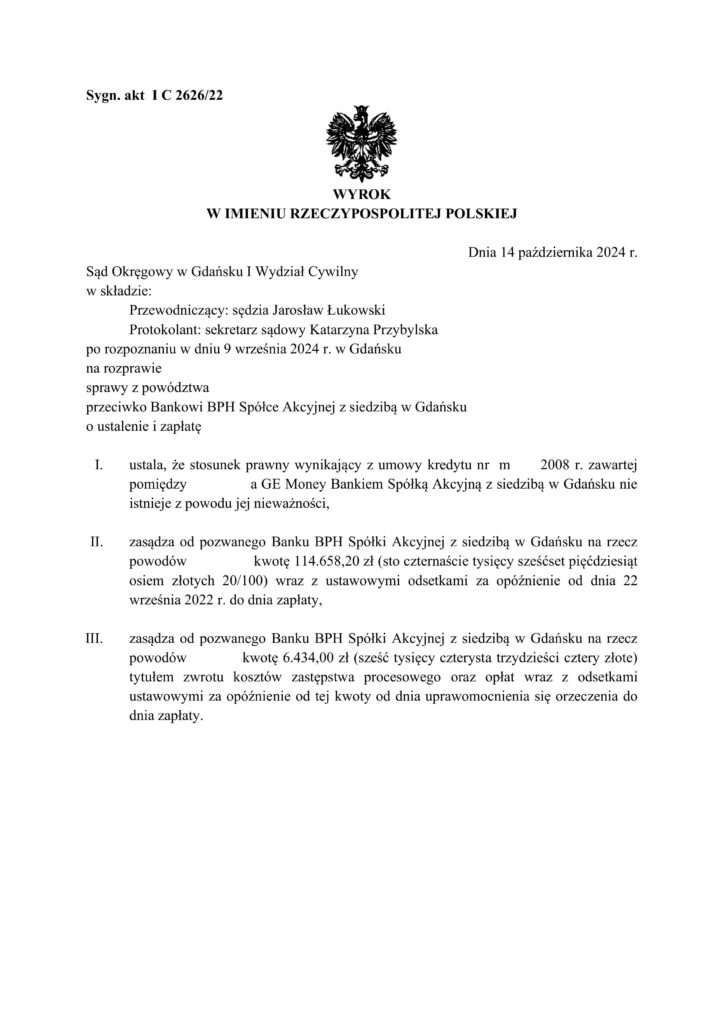 Sąd Okręgowy w Gdańsku I Wydział Cywilny po rozpoznaniu sprawy przeciwko Bankowi BPH Spółce Akcyjnej z siedzibą w Gdańsku ustalił, że stosunek prawny wynikający z umowy kredytuzawartej pomiędzy naszymi klientami a GE Money Bankiem Spółką Akcyjną z siedzibą w Gdańsku nie istnieje z powodu jej nieważności. Zasądził od pozwanego Banku BPH na rzecz powodów kwotę 114.658,20 zł wraz z ustawowymi odsetkami za opóźnienie od dnia 22 września 2022 r. do dnia zapłaty.
