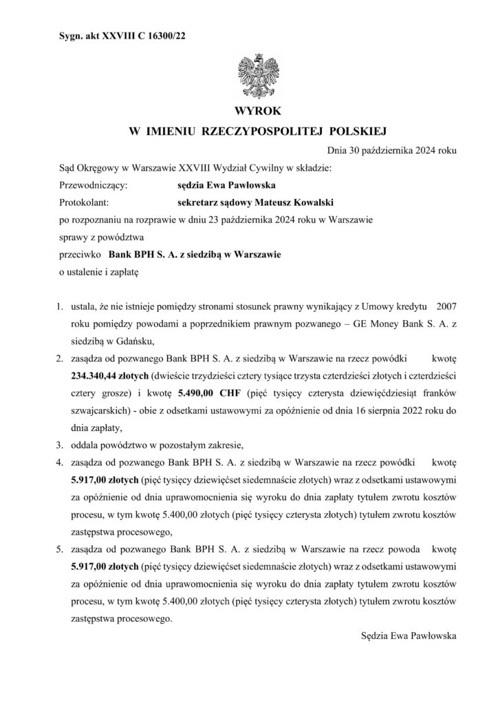 Zasądził od pozwanego Bank BPH S. A. z siedzibą w Warszawie na rzecz powódki kwotę 234.340,44 złotych i kwotę 5.490,00 CHF- obie z odsetkami ustawowymi za opóźnienie od dnia 16 sierpnia 2022 roku do dnia zapłaty.
