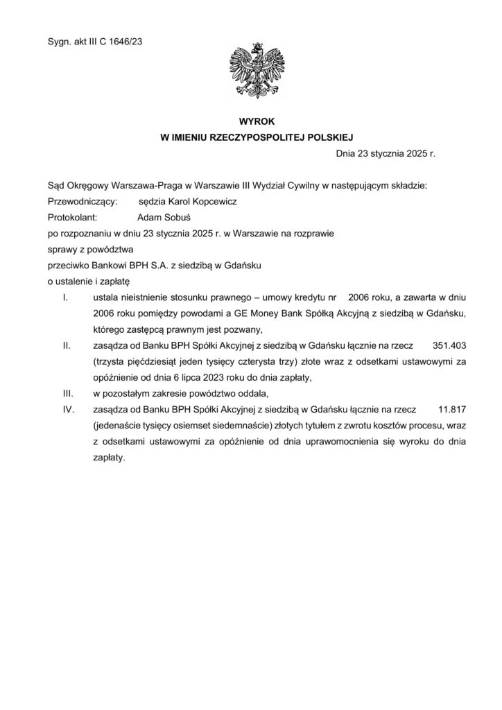 Zasądził od Banku łącznie na rzecz powodów 351.403 złote wraz z odsetkami ustawowymi za opóźnienie od dnia 6 lipca 2023 roku do dnia zapłaty.