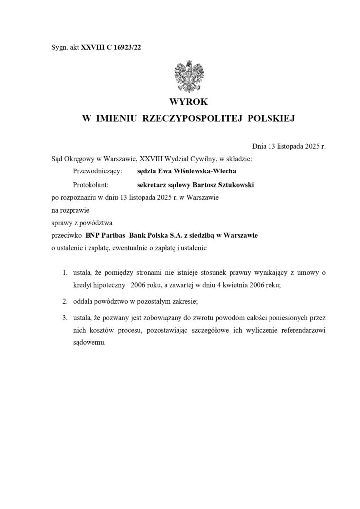 13 listopada 2025 r. Sąd Okręgowy w Warszawie unieważnił umowę kredytu hipotecznego z 2006 roku zawartą z BNP Paribas. Sąd jednoznacznie stwierdził, że stosunek prawny z tej umowy nie istnieje, a bank musi zwrócić Klientom całość kosztów procesu. To kolejny dowód na to, że wadliwe umowy kredytowe — niezależnie od banku — mogą zostać skutecznie zakwestionowane w sądzie. Unieważnienie oznacza dla kredytobiorców uwolnienie się od zobowiązania i odzyskanie tysięcy złotych.