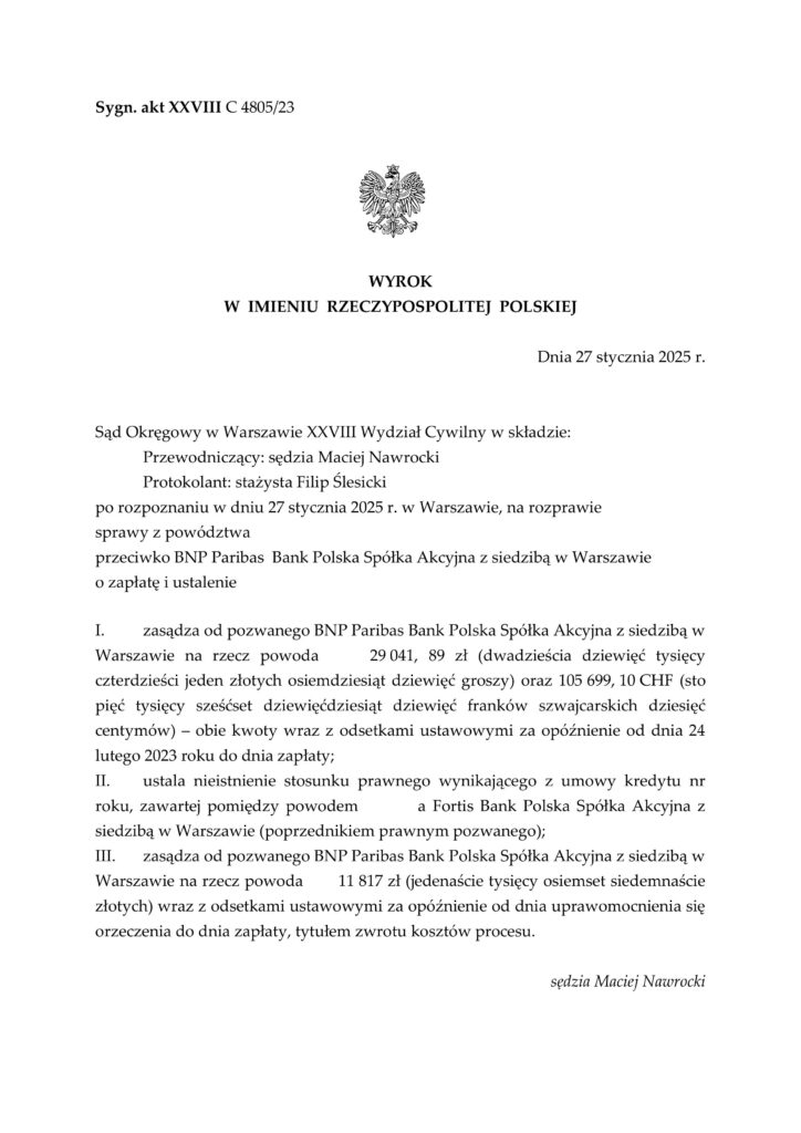 Sąd Okręgowy w Warszawie XXVIII Wydział Cywilny w po rozpoznaniu sprawy przeciwko BNP Paribas Bank Polska Spółka Akcyjna z siedzibą w Warszawie ustalił, że umowa jest nieważna. Zasądził od pozwanego BNP Paribas Bank Polska na rzecz powoda 29 041, 89 zł oraz 105 699, 10 CHF – obie kwoty wraz z odsetkami ustawowymi za opóźnienie od dnia 24 lutego 2023 roku do dnia zapłaty.