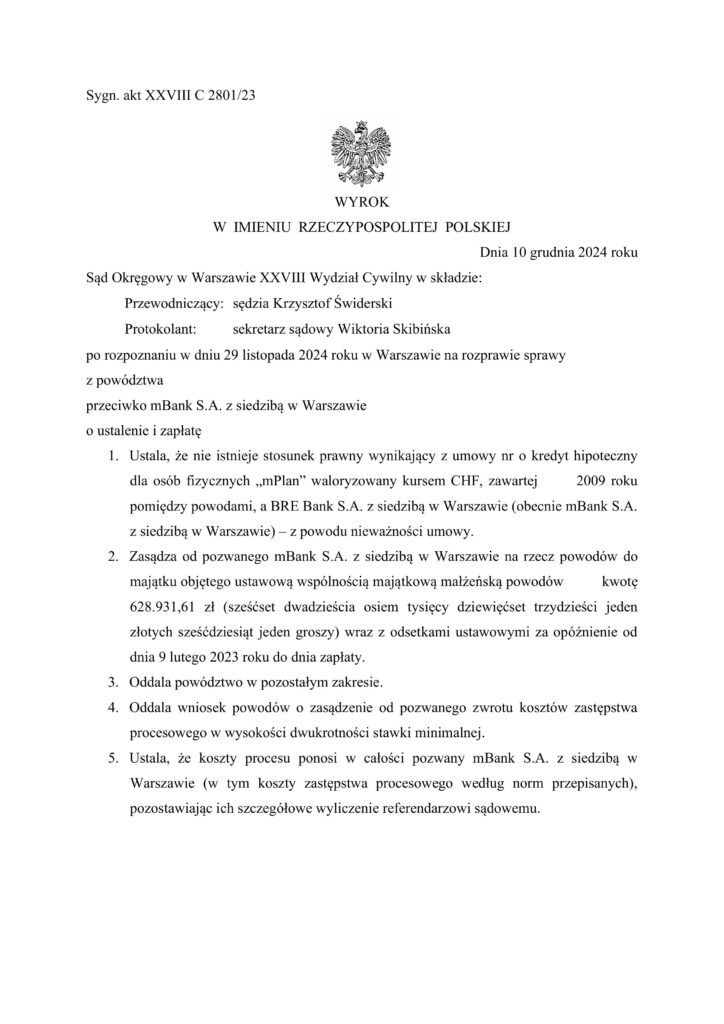 Sąd Okręgowy w Warszawie XXVIII Wydział Cywilny po rozpoznaniu sprawy przeciwko mBank S.A. z siedzibą w Warszawie ustalił, że nie istnieje stosunek prawny wynikający z umowy zawartej w dniu 16 pomiędzy powodami, a BRE Bank S.A. z siedzibą w Warszawie (obecnie mBank S.A. z siedzibą w Warszawie) – z powodu nieważności umowy.