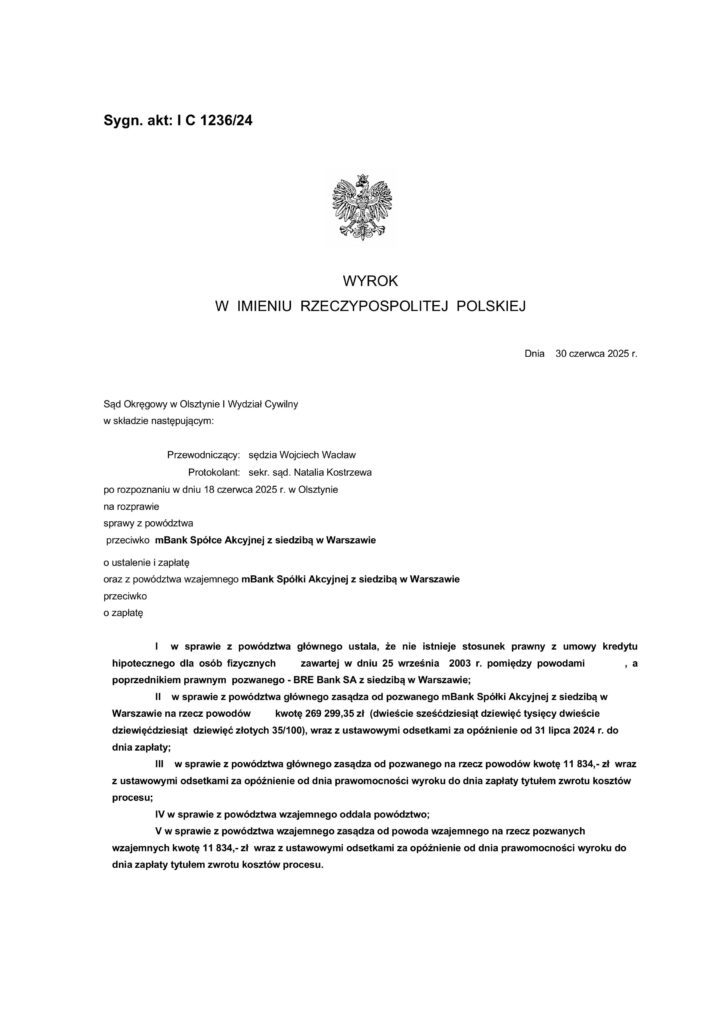 Sąd Okręgowy w Olsztynie ustalił nieważność umowy kredytu frankowego zawartej z poprzednikiem prawnym mBanku oraz zasądził na rzecz naszych Klientów zwrot ponad 269 tys. zł wraz z odsetkami. Dodatkowo Bank został zobowiązany do zwrotu pełnych kosztów procesu – zarówno w sprawie głównej, jak i po oddaleniu powództwa wzajemnego. To kolejny przykład na to, że warto walczyć o swoje prawa – z pomocą doświadczonych prawników i na gruncie jasnych orzeczeń TSUE.