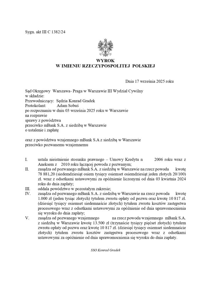 Kolejny sukces naszej kancelarii! Dnia 17 września 2025 r. Sąd Okręgowy Warszawa–Praga w Warszawie (III Wydział Cywilny) stwierdził nieistnienie umowy kredytu z 2006 r. wraz z aneksem z 2010 r. zawartej z mBank S.A. Na rzecz naszego Klienta zasądzono: 78 881,20 zł wraz z odsetkami, zwrot opłaty od pozwu i ponad 10 tys. zł kosztów zastępstwa procesowego.