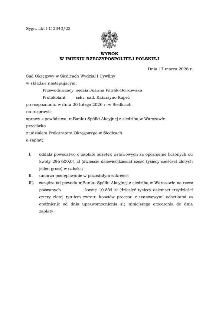 17 marca 2026 r. Sąd Okręgowy w Siedlcach, I Wydział Cywilny, wydał wyrok w sprawie z powództwa mBank S.A. przeciwko kredytobiorcom. Sprawa dotyczyła roszczeń banku o zapłatę, a po stronie postępowania występował również Prokurator Okręgowy w Siedlcach.