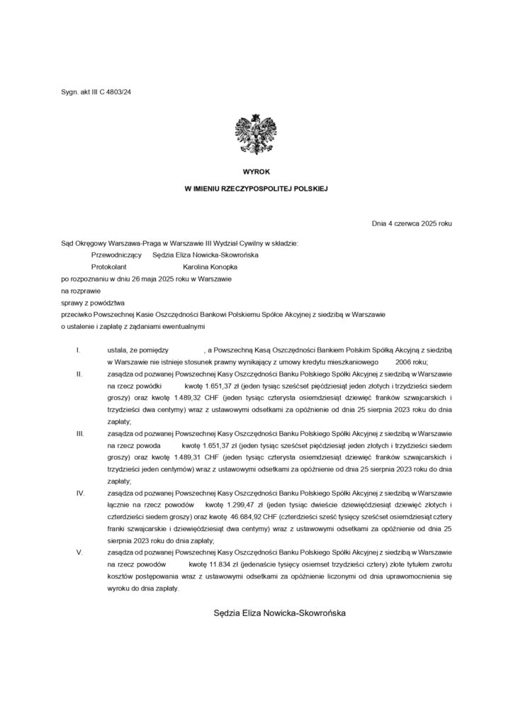 Sąd Okręgowy Warszawa–Praga w Warszawie uznał, że umowa kredytu mieszkaniowego zawarta w 2006 roku z jednym z największych banków w Polsce jest nieważna. Co orzekł sąd? Stwierdził nieważność umowy kredytu hipotecznego i zasądził zwrot ponad 49.000 CHF oraz ponad 3.300 zł na rzecz naszych Klientów. Przyznał zwrot pełnych kosztów postępowania – ponad 11.800 zł. To nie tylko konkretne kwoty – to również ogromna ulga psychiczna i finansowa dla naszych Klientów. To także kolejny sygnał, że warto walczyć o swoje prawa – nawet jeśli umowa została podpisana niemal 20 lat temu.