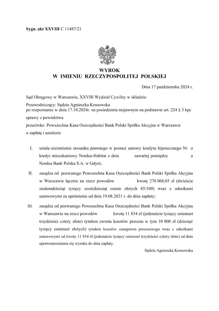 Sąd Okręgowy w Warszawie, XXVIII Wydział Cywilny po rozpoznaniu sprawy przeciwko Powszechna Kasa Oszczędności Bank Polski Spółka Akcyjna w Warszawie ustalił nieistnienie stosunku prawnego w postaci umowy o kredyt mieszkaniowy Nordea-Habitat zawartej pomiędzy naszymi klientami a Nordea Bank Polska S.A. w Gdyni.