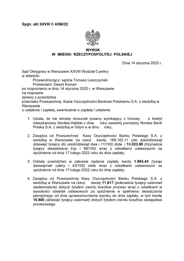 Zasądził od Powszechnej Kasy Oszczędności Banku Polskiego S.A. z siedzibą w Warszawie na rzecz klientki kwoty: 169.162,11 wraz z odsetkami ustawowymi za opóźnienie od dnia 17 lutego 2022 roku do dnia zapłaty.