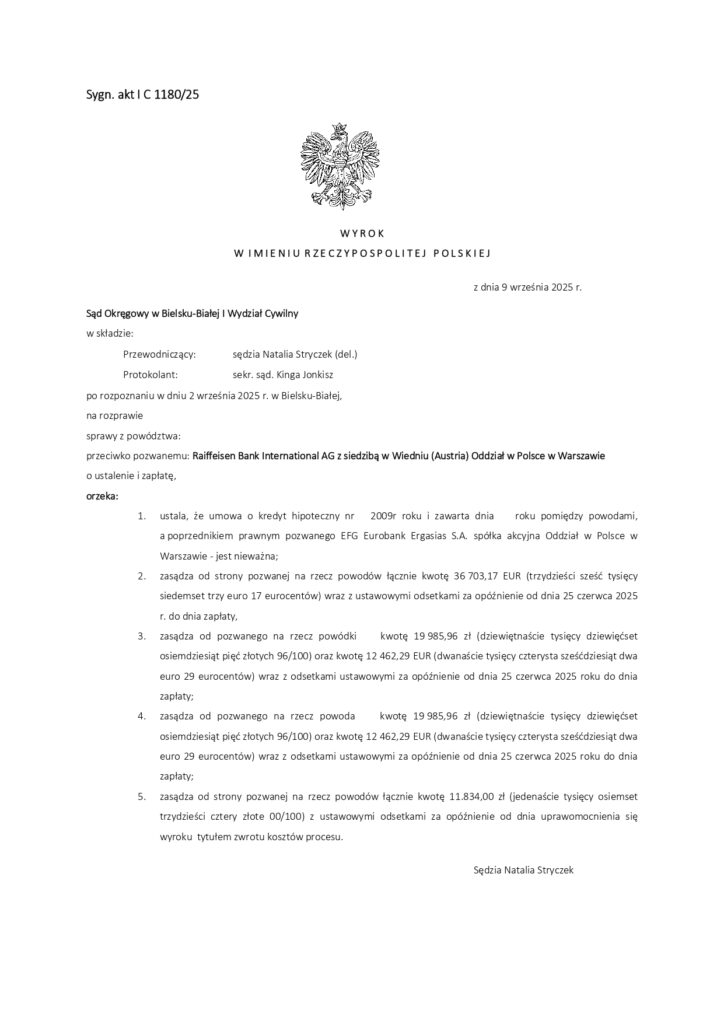 Sąd Okręgowy w Bielsku-Białej I Wydział Cywilny po rozpoznaniu sprawy przeciwko pozwanemu: Raiffeisen Bank International AG z siedzibą w Wiedniu (Austria) Oddział w Polsce w Warszawieo ustalenie i zapłatę, ustalił, że umowa o kredyt hipoteczny z 2009r. pomiędzy powodami, a poprzednikiem prawnym pozwanego EFG Eurobank Ergasias S.A. spółka akcyjna Oddział w Polsce w Warszawie – […]